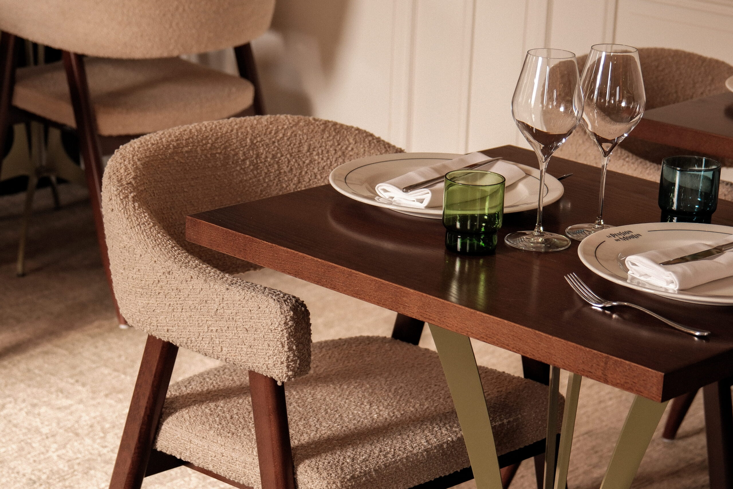 À La Pension du Moulin, la cuisine se vit comme un moment de partage. En salle ou en extérieur aux beaux jours, la terrasse du restaurant s’ouvre sur la place du village, véritable lieu de vie qu’elle forme avec le bar Les Nabis, du déjeuner jusqu’à la nuit tombée.